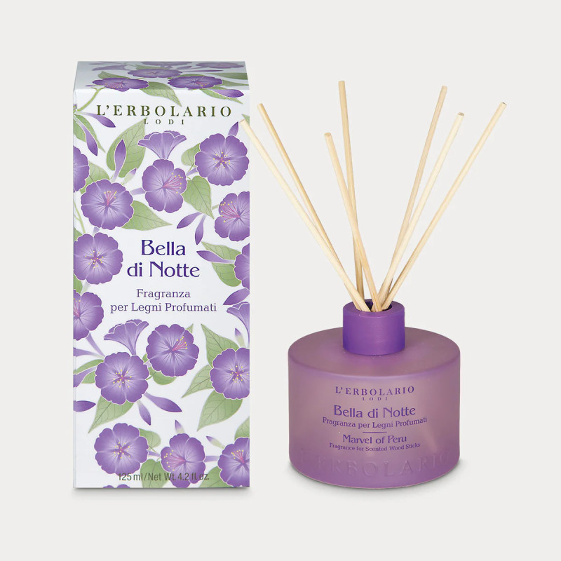 Basta immergere i legnetti in rattan in questo elegante flacone in vetro per diffondere negli ambienti domestici un profumo fiorito e vanigliato, ammaliante come i petali di Bella di Notte, che si aprono dopo il tramonto per sprigionare un delicato sentore.