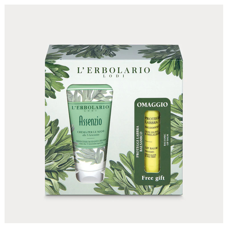 La Crema per le Mani Assenzio, formulata con estratti tonificanti di Assenzio, Dragoncello e Genepì, è proposta in questo kit in abbinamento al Balsamo labbra protettivo con Olivo e Melaleuca, in omaggio.