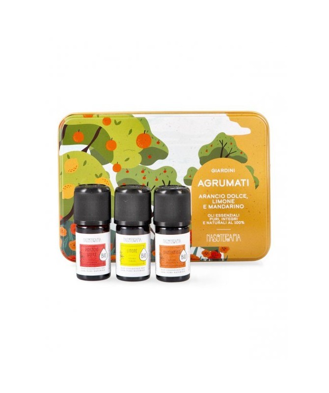 Nasoterapia - Il Cofanetto con Oli Essenziali - Giardini Agrumati contiene tre oli essenziali puri e naturali, uniti da una una sfumatura olfattiva comune: il profumo fresco e frizzante degli agrumi.