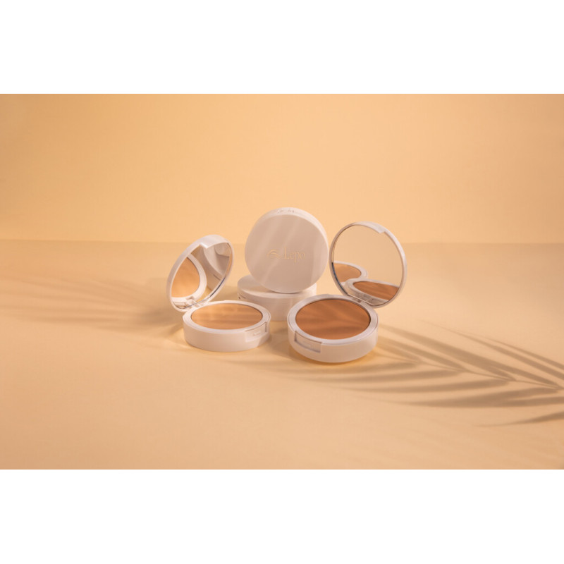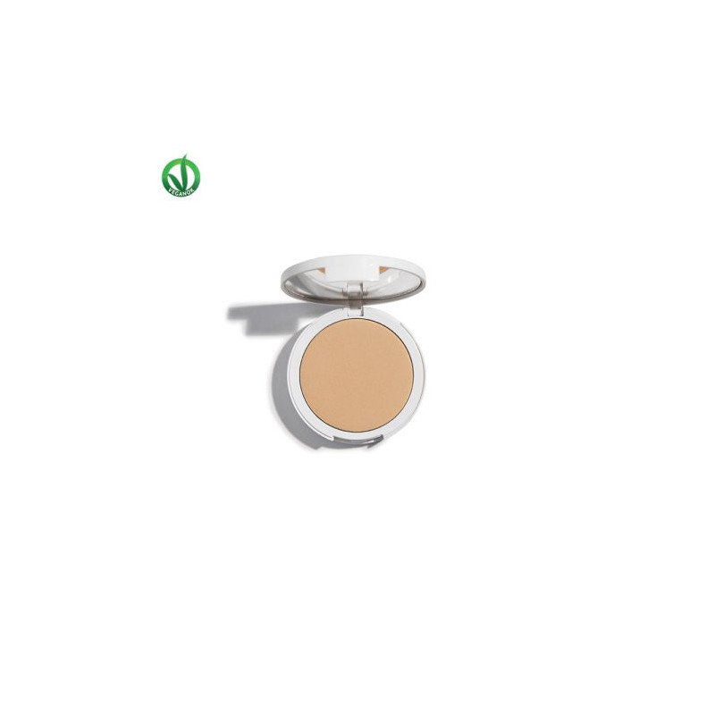 Fondotinta compatto ad alta protezione solare con filtri fisici e polvere di tapioca.