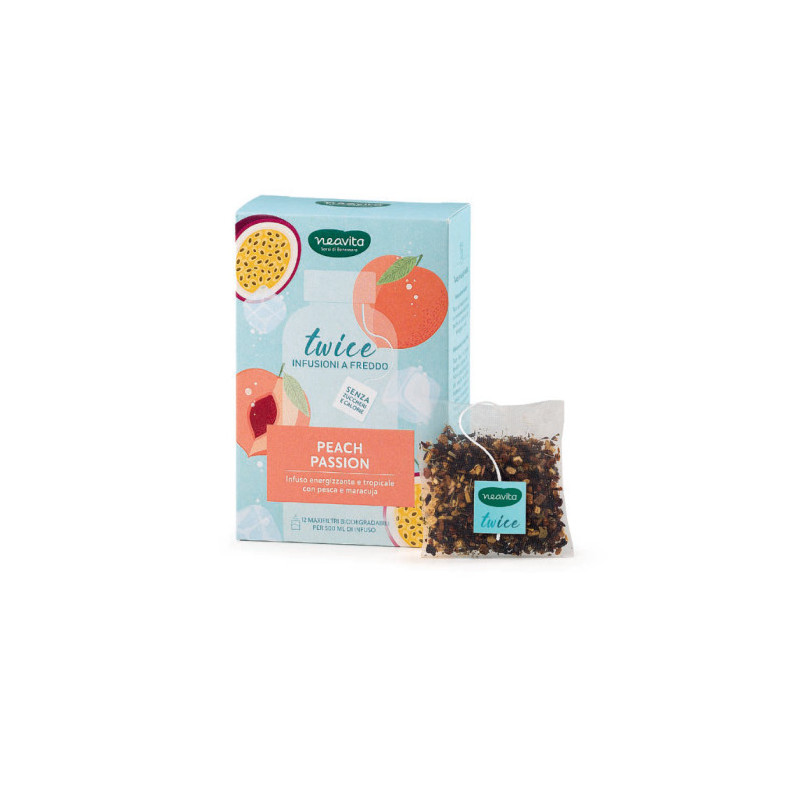 Il benessere di Twice sempre con te. Il maxi filtro ospita la quantità ideale di piante, fiori e frutti per l’infusione in mezzo litro d’acqua. Perfetto da utilizzare con le borracce termiche Neavita. Le note inconfondibili della pesca incontrano la dolcezza acidula del frutto della passione, per idratarsi con gusto ed energia.