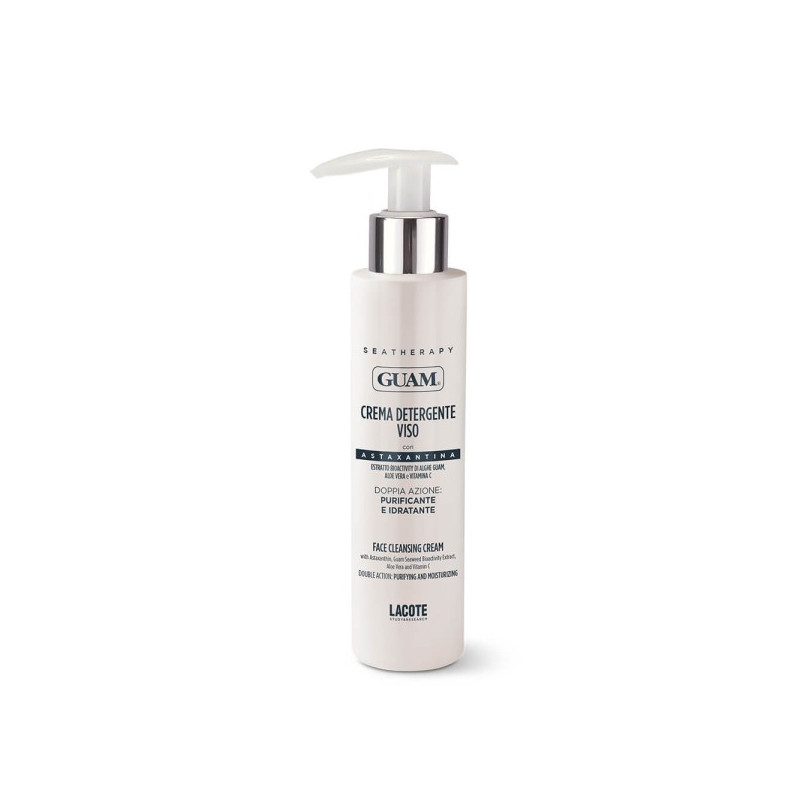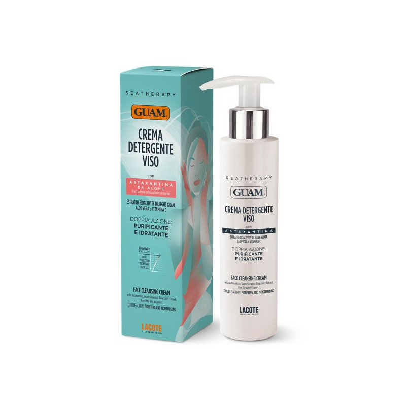 Formulata per la detersione delicata di viso e collo, Guam® SeaTherapy Crema Detergente Viso strucca e rimuove le impurità, con effetto setificante offrendo una duplice azione per la cura quotidiana della pelle del viso. Con la sua formula bilanciata, deterge efficacemente rimuovendo impurità e residui di trucco, mentre contemporaneamente idrata la pelle rispettandone il pH fisiologico e restituendole la sua naturale luminosità. Grazie alla sinergia tra il mix attivo idratante, l’Astaxantina da Alghe (il più potente antiossidante al mondo), la Vitamina C, l’Aloe Vera e l’Estratto Bioactivity di Alghe Guam® restituisce idratazione e morbidezza al viso dopo la detersione, proteggendo la pelle dall’azione dei radicali liberi.