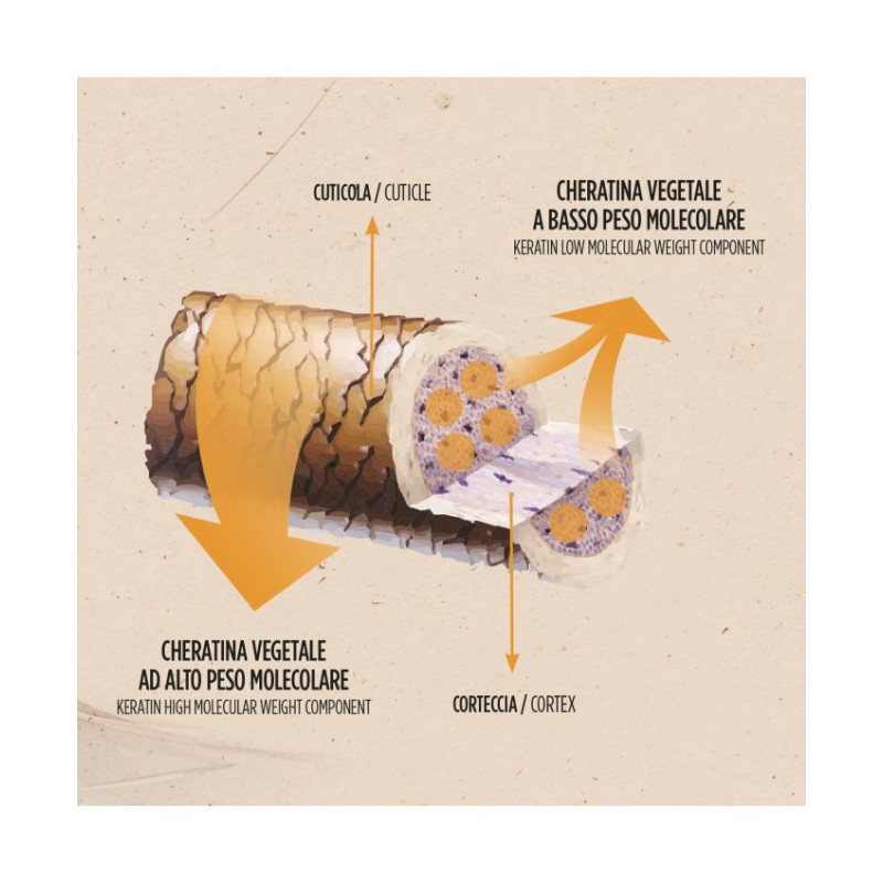 Grazie al mix di Cheratina Vegetale, Alga Undaria Pinnatifida e proteine di Quinoa, il suo uso continuativo aiuta a riparare la fibra del capello per un effetto setificante intenso.